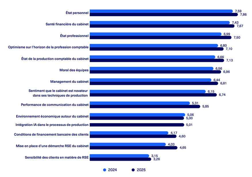 - Optimisme plus prononcé sur l’avenir de la profession (7,34/10),